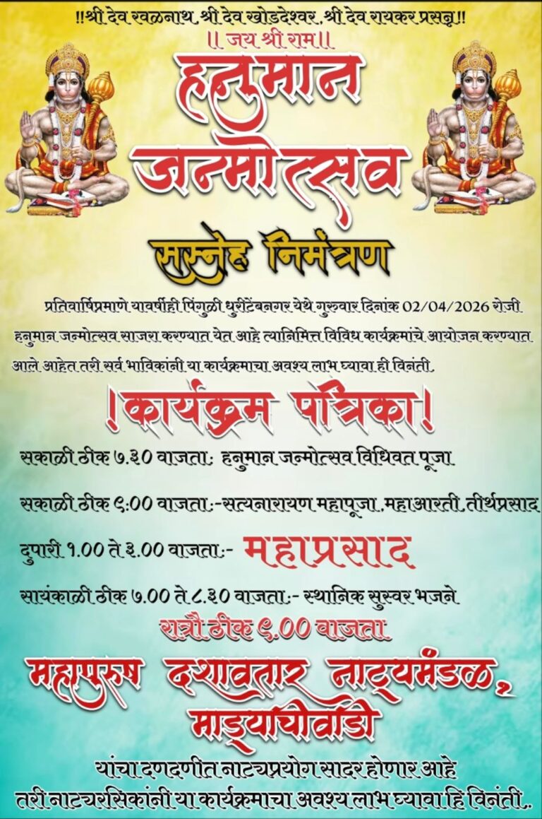 कुडाळ : प्रतिवर्षाप्रमाणे यावर्षीही पिंगुळी धुरीटेंबनगर येथे गुरुवार दिनांक २ एप्रिल २०२६ रोजी हनुमान जन्मोत्सव साजरा करण्यात येत आहे. त्यानिमित्त विविध कार्यक्रमांचे आयोजन करण्यात आले आहे. 🔹कार्यक्रम पत्रिका 🔹 सकाळी ठीक 7:30 वाजता हनुमान जन्मोत्सव विधिवत पूजासकाळी ठीक 9:00 वाजता…