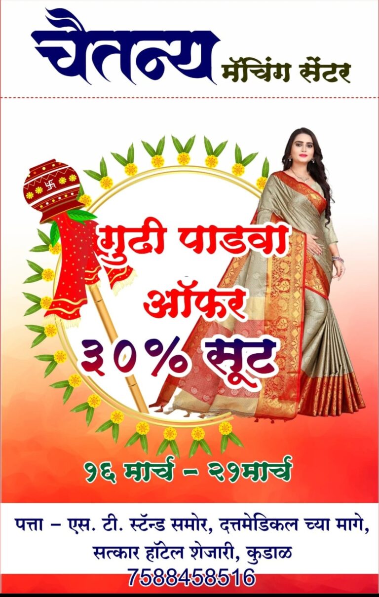 💫 प्रत्येक खरेदीवर ३०% सूट 💫 ऑफर – २६ ते २१ मार्चपर्यंत 📍 आमचा पत्ता : एस. टी. स्टँड समोर, सत्कार हॉटेल रोड, कुडाळ ☎️ संपर्क : 7588458516
