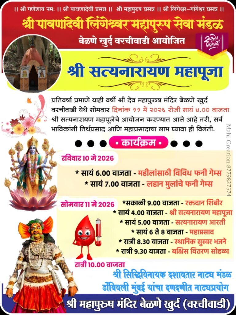 कणकवली : बेळणे खुर्द येथील श्री महापुरुष मंदिर परिसरात ‘श्री पावणादेवी लिंगेश्वर महापुरुष सेवा मंडळ’ आयोजित दरवर्षीप्रमाणे यावर्षीही श्री सत्यनारायण महापूजा आणि विविध सांस्कृतिक कार्यक्रमांचे आयोजन करण्यात आले आहे. १० आणि ११ मे रोजी हा उत्सव मोठ्या उत्साहात साजरा होणार…