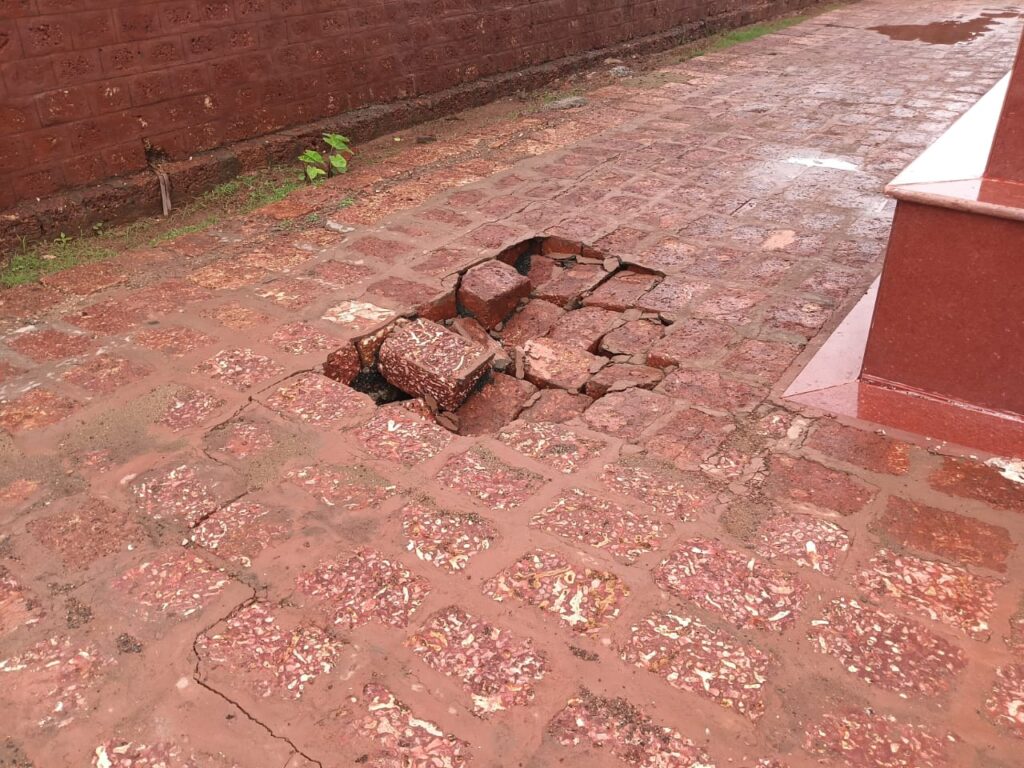 मालवण : छत्रपती शिवाजी महाराजांच्या राजकोट येथील उभारण्यात आलेल्या पुतळ्याच्या चबुतऱ्यालगतची जमीन खचल्याचा धक्कादायक प्रकार समोर आला आहे. पुतळ्याच्या डाव्या बाजूला भगदाड पडले आहे. तर त्या ठिकाणची जमीन खोलवर खचल्याचे दिसत आहे. पुतळा भक्कम असून जमीन खचल्यामुळे बांधकाम निकृष्ट झाल्याचे जाणकारांचे म्हणणे आहे.