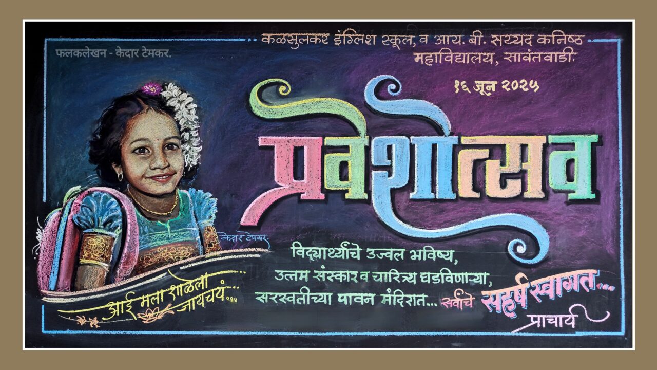 . शाळेतला पहिला दिवस म्हणजे नवीन दप्तर, नवीन पुस्तके, नवा वर्ग, नवीन मित्र मैत्रिणी, नवीन शिक्षक… त्याचबरोबर नव्या शाळेत उज्वल भविष्याची स्वप्न घेऊन आईच्या पदराआड लपत शपथ येणाऱ्या मुलांमधील एक गोड मुलीचे चित्र रंगीत खडूच्या माध्यमातून शाळेच्या दर्शनी फलकावर रेखाटण्याचा प्रयत्न कळसुलकर इंग्लिश स्कूल व आय.बी. सय्यद कनिष्ठ महाविद्यालय सावंतवाडी येथील कलाशिक्षक श्री. केदार टेमकर यांनी साकारण्याचा प्रयत्न केला आहे.