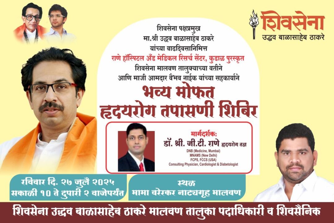 मालवण : शिवसेना उद्धव बाळासाहेब ठाकरे पक्षाचे पक्षप्रमुख माजी मुख्यमंत्री मा. श्री. उद्धवजी ठाकरे यांच्या वाढदिवसाचे औचित्य साधून मालवण शहरामध्ये मामा वरेरकर नाट्यगृह येथे राणे हॉस्पिटल रिचर्स सेंटर पुरस्कृत डॉ. जी. टी. राणे यांच्या प्रमुख उपस्थितीत हृदयरोग तपासणी आरोग्य शिबिर रविवार दिनांक २७/०७/२०२५ रोजी सकाळी ठीक १० वा. ते दुपारी ०२.०० वाजेपर्यंत आयोजित करण्यात आले आहे.