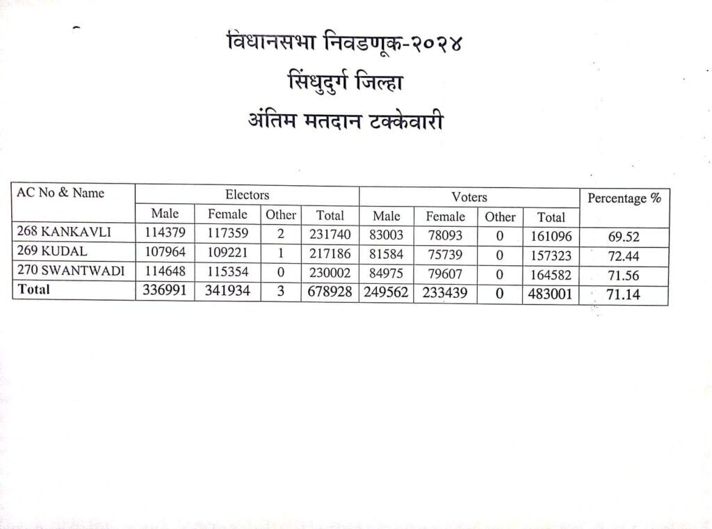 तर सिंधुदुर्ग जिल्ह्यात दिवसा अखेर एकूण ७१.११ टक्के मतदान