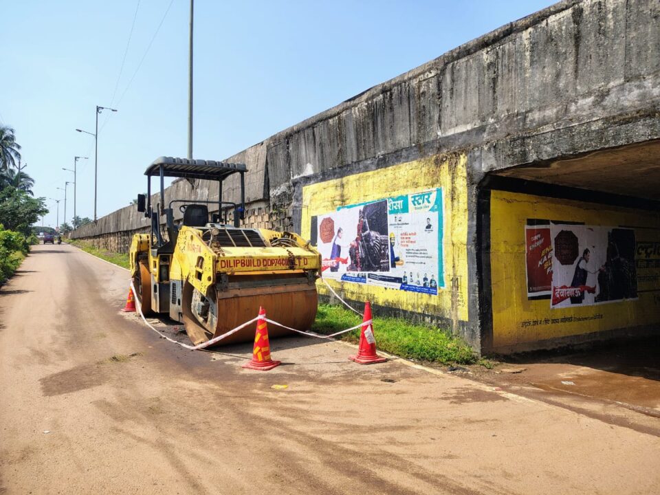 मिळालेल्या माहितीनुसार, ‘दिलीप बिल्डकॉन’ कंपनीच्या मालकीचा पिवळ्या रंगाचा हा रोड रोलर (ज्यावर ‘DILIP BUILDC’ असे लिहिले आहे) कुडाळमधील काळप नाका येथे बॉक्सवेलच्या अगदी बाजूला सर्विस रोडवर बंद पडला आहे. बंद अवस्थेत असलेल्या या रोलरला सध्या सुरक्षा म्हणून केवळ दोन-तीन लाल रंगाचे कोन (cones) आणि एक पांढरी-लाल दोरी बांधलेली आहे, जी अत्यंत अपुरी आणि धोकादायक आहे.