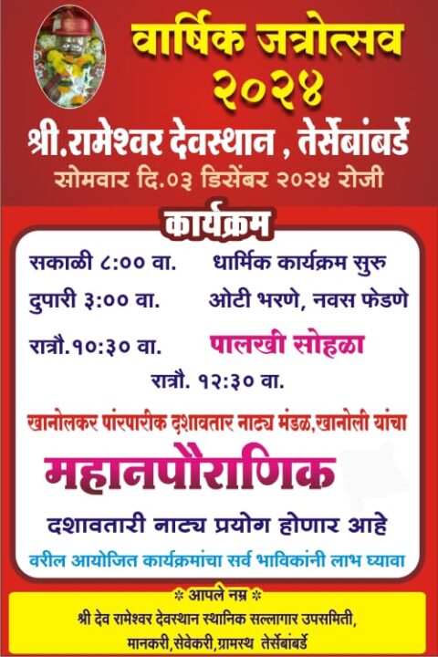 कुडाळ प्रतिनिधी: तेर्सेबांबर्डे येथील श्री देव रामेश्वरचा जत्रोत्सव 3 डिसेंबर रोजी होणार आहे. सकाळी 8 वाजता धार्मिक कार्यक्रम, संध्याकाळी 3 वा ओटी भरणे, रात्री 10.30 वाजता पालखी सोहळा, रात्री 12 .30 वा खानोलकर पारंपरिक दशावतार नाट्य मंडळ, खानोली यांचा नाट्य प्रयोग होईल .तरीही सर्व भाविकांनी उपस्थित राहावे, असे आवाहन श्री देव रामेश्वर मंदिरचे मानकरी , सेवेकरी , ग्रामस्थ व देवस्थान उपसमितीच्या वतीने करण्यात आले आहे.