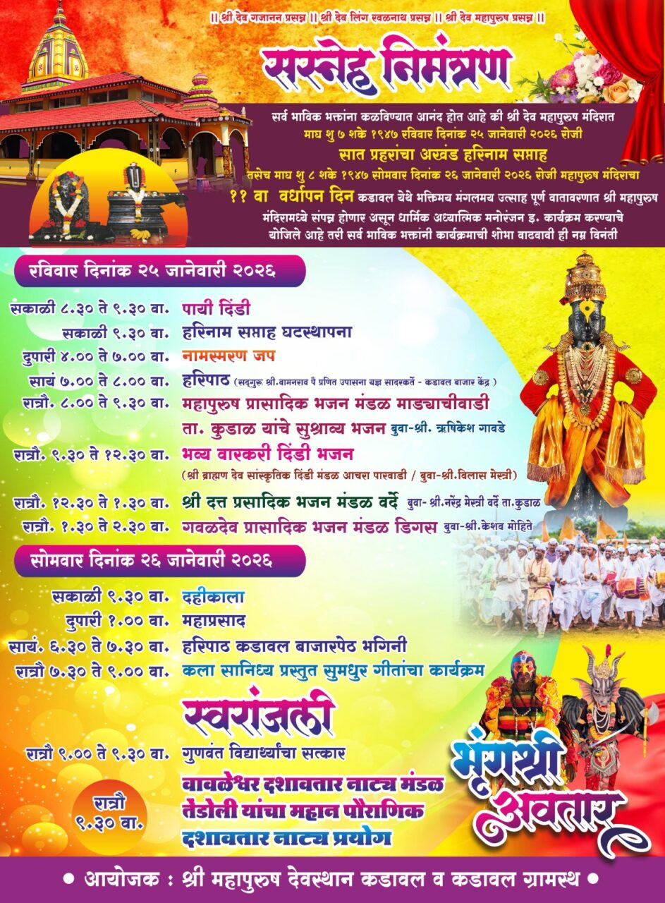 कुडाळ : रविवार दिनांक २५ जानेवारी २०२६ रोजी श्री देव महापुरुष मंदिर कडावल येथे सात प्रकारांचा अखंड हरिनाम सप्ताह आयोजित करण्यात आला आहे. तसेच सोमवार दिनांक २६ जानेवारी २०२६ रोजी मंदिराच्या अकराव्या वर्धापन दिनानिमित्त विविध धार्मिक आणि सांस्कृतिक कार्यक्रमांचे आयोजन करण्यात आले आहे.