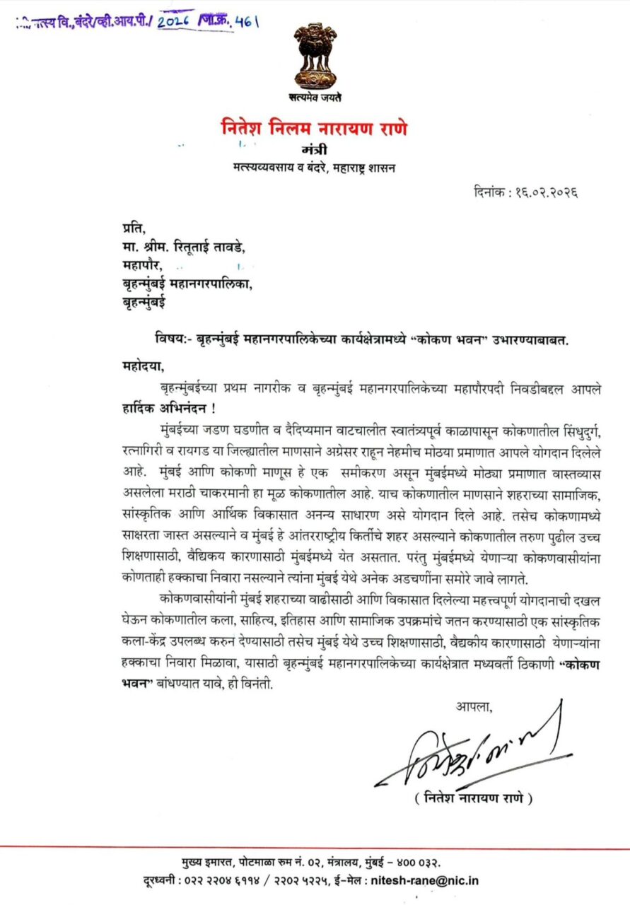 मुंबई : राज्याचे कॅबिनेट मंत्री तथा सिंधुदुर्गचे पालकमंत्री श्री.नितेश राणे यांनी मुंबई महानगरपालिकेच्या कार्यक्षेत्रात मध्यवर्ती ठिकाणी ‘कोकण भवन’ उभारण्यात यावे, अशी मागणी मुंबईच्या नवनिर्वाचित महापौर श्रीमती रितू तावडे यांच्याकडे पत्राद्वारे केली आहे. यावेळी मुंबईच्या महापौर पदावर निवड झाल्याबद्दल मंत्री नितेश राणे यांनी महापौर रितू तावडे यांचे अभिनंदनही केले आहे.