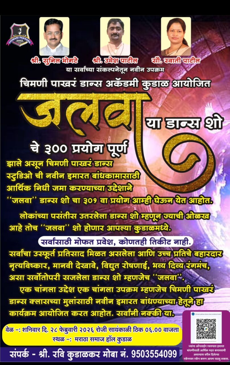 चिमणी पाखर डान्स अकॅडमी कुडाळ आयोजित ‘जलवा’ या डान्स शो चा 301 वा प्रयोग शनिवार दिनांक 28 फेब्रुवारी 2026 रोजी सायंकाळी ठीक सहा वाजता मराठा समाज हॉल कुडाळ या ठिकाणी होणार आहे. सर्वांनी या कार्यक्रमाला मोठ्या संख्येने उपस्थित राहावे असे आवाहन करण्यात आले आहे.