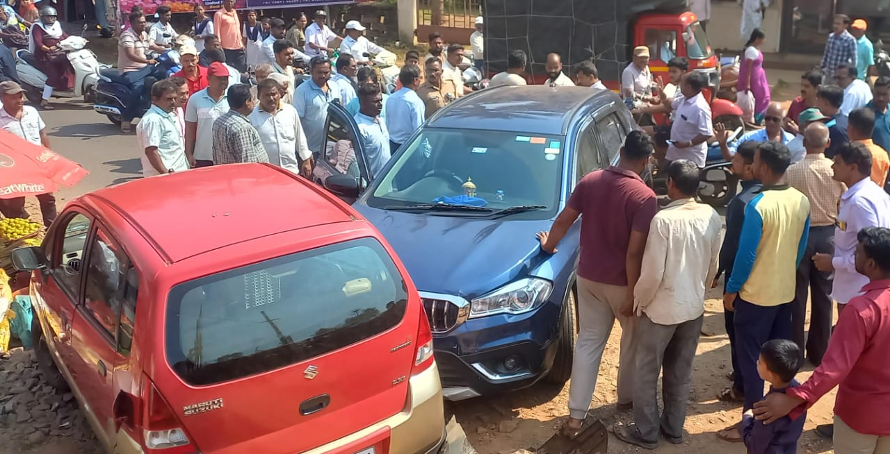 कुडाळ : कुडाळ शहरातील पोस्ट ऑफिस चौक येथे आज सकाळी १०.५० वाजताच्या सुमारास चालकाचे नियंत्रण सुटलेल्या कारने थरार उडविला. सदर कारने मुख्य रस्त्यावर गोल फिरत रस्त्यावर असलेल्या दुचाकीला ठोकर देत, नंतर उभ्या असलेल्या दुस-या कारला जोरदार धडक दिली. या घटनेने तेथील पादचारी नागरिक तसेच विक्रेत्यांची पळापळ झाली. या चौकात मोठ्या प्रमाणात वाहनांची तसेच नागरिकांची रहदारी असते. मात्र सुदैवाने मोठा अनर्थ टळला. या अपघातात दोन्ही कारचे नुकसान झाले आहे.