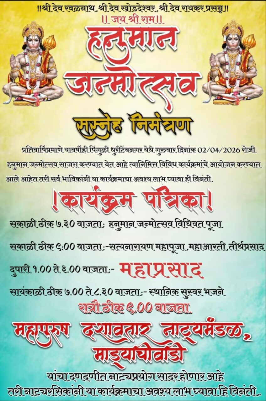 कुडाळ : प्रतिवर्षाप्रमाणे यावर्षीही पिंगुळी धुरीटेंबनगर येथे गुरुवार दिनांक २ एप्रिल २०२६ रोजी हनुमान जन्मोत्सव साजरा करण्यात येत आहे. त्यानिमित्त विविध कार्यक्रमांचे आयोजन करण्यात आले आहे.