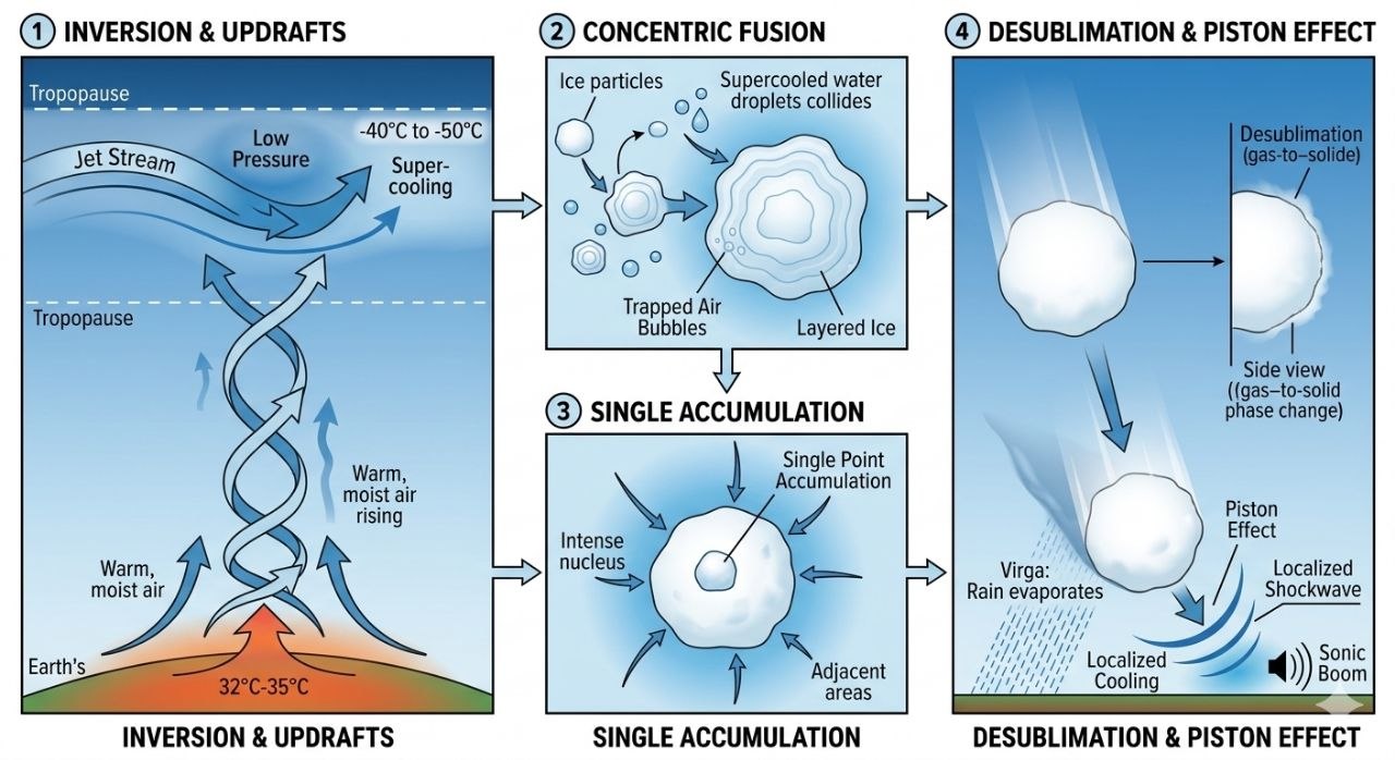 मालवणच्या किनारपट्टीवर हवेतील आर्द्रता जास्त असते. उन्हाळ्यात जमिनीवर प्रचंड उष्णता असल्याने हवा हलकी होऊन वेगाने वर जाते. ही खालची आर्द्र हवा दुपारच्या वेळी वर जाते ( हवेचा ऊर्ध्वगामी प्रवाह) आणि उंचावर असलेल्या या पश्चिमेकडील थंड जेट स्ट्रीमच्या संपर्कात येते, तेव्हा तिचे रूपांतर अचानक बर्फाच्या गोळ्यात होते. वरच्या कमी दाबाच्या पट्टयाकडे हजारो लहान गारा किंवा बर्फाचे कण गतिशीलतेने एकमेकांना चिकटून एकच मोठा बर्फाचा गोळा तयार होतो. हे जेट स्ट्रीम मधील वारे इतके शक्तिशाली असतात की, ते बर्फाच्या कणांना बराच वेळ उंचावर तरंगत ठेवतात. जोपर्यंत तो बर्फाचा गोळा ५ किलोसारखा जड होत नाही, तोपर्यंत हे जेट स्ट्रीमशी संबंधित वारे त्याला खाली पडू देत नाहीत. लहान – लहान गोळ्यांचे थरावर थर साचतात आणि जड महाकाय गारा म्हणजे मेगाक्रायोमेटोर (Megacryometeor) तयार होतो. जर त्या गोळ्याचे निरीक्षण केल्यास त्यामध्ये अनेक गोळे एकत्र झाल्यामुळे स्तर निर्माण झालेले दिसून येत आहेत.