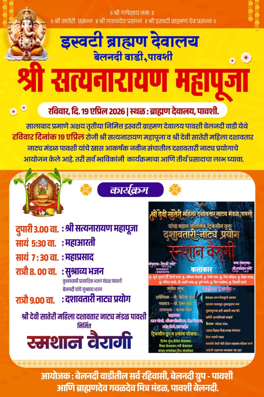 योगिता कानडे/कुडाळ : पावशी येथील इस्वटी ब्राह्मण देवालय, बेलनदी वाडी येथे अक्षय तृतीयेच्या निमित्ताने दरवर्षीप्रमाणे यंदाही रविवार, दिनांक १९ एप्रिल २०२६ रोजी भव्य ‘श्री सत्यनारायण महापूजा’ आणि विविध धार्मिक व सांस्कृतिक कार्यक्रमांचे आयोजन करण्यात आले आहे.