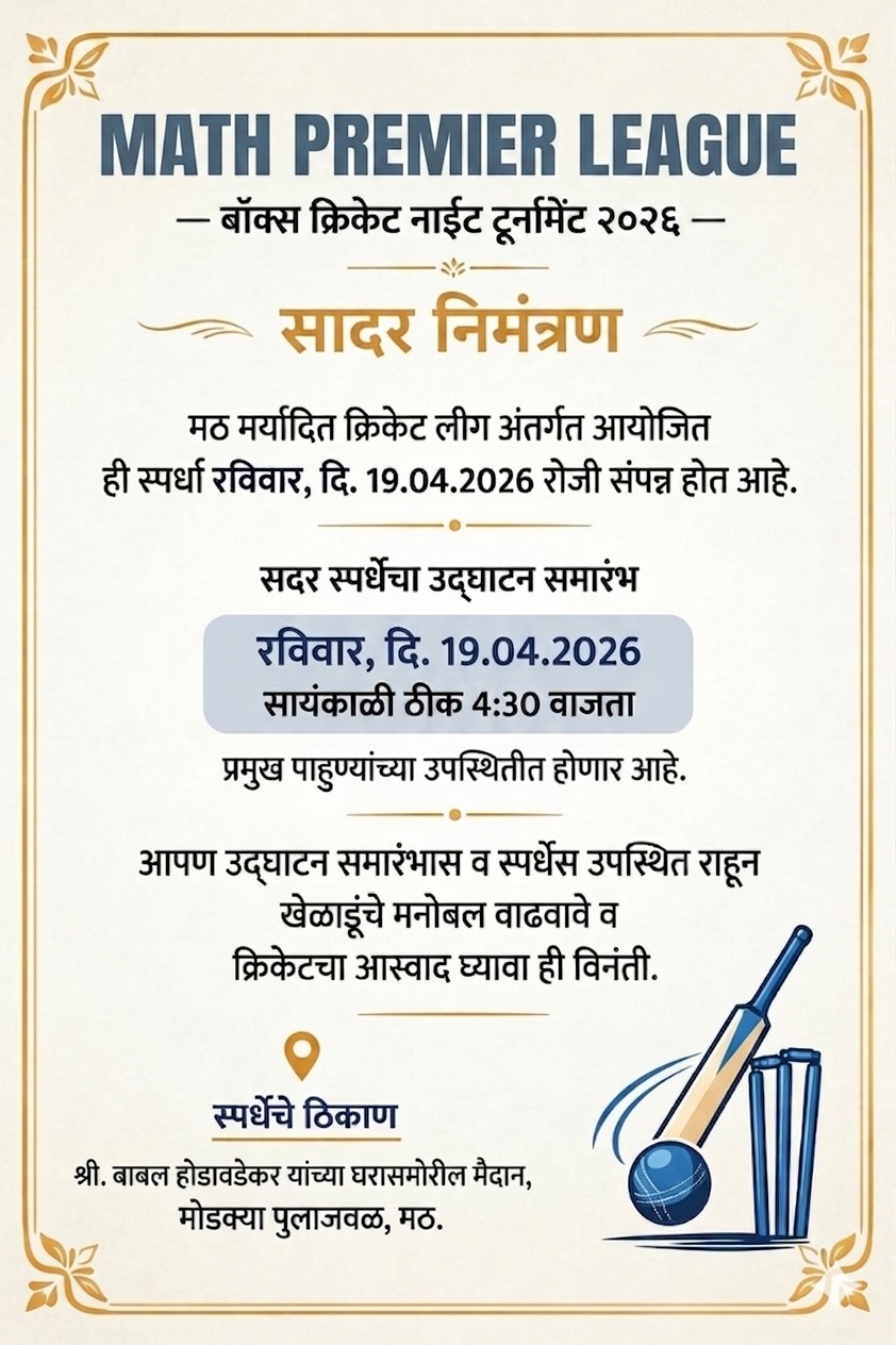 वेंगुर्ला : रविवार दिनांक १९ एप्रिल २०२६ रोजी वाजता मठ प्रीमियर लीग या भव्य बॉक्स नाइट क्रिकेट स्पर्धेचे आयोजन करण्यात आले आहे. या स्पर्धेचा उद्घाटन समारंभ सायं ठीक ४.३० प्रमुख पाहुण्यांच्या उपस्थितीत संपन्न होणार आहे. तरी सर्व क्रिकेटप्रेमींनी या स्पर्धेला उपस्थित राहून स्पर्धेचा आस्वाद घ्यावा असे आवाहन आयोजकांनी केले आहे.