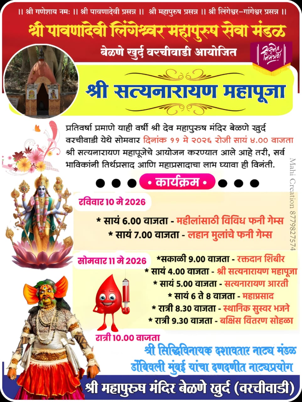 कणकवली : बेळणे खुर्द येथील श्री महापुरुष मंदिर परिसरात ‘श्री पावणादेवी लिंगेश्वर महापुरुष सेवा मंडळ’ आयोजित दरवर्षीप्रमाणे यावर्षीही श्री सत्यनारायण महापूजा आणि विविध सांस्कृतिक कार्यक्रमांचे आयोजन करण्यात आले आहे. १० आणि ११ मे रोजी हा उत्सव मोठ्या उत्साहात साजरा होणार आहे.