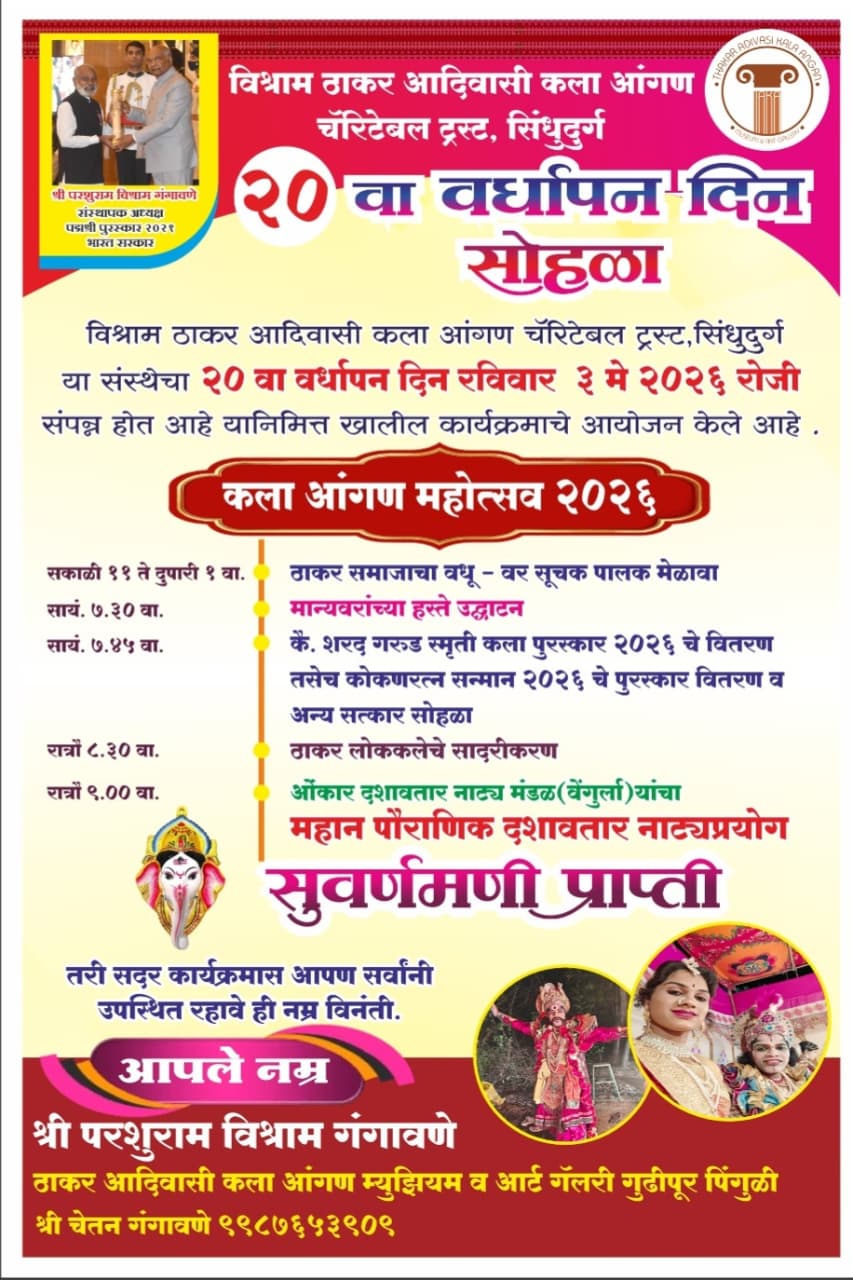 कुडाळ : विश्राम ठाकर आदिवासी कला आंगणचा २० वा वर्धापन दिन रविवार दिनांक ३ मे २०२६ रोजी संपन्न होत आहे. यानिमित्त विविध कार्यक्रमांचे आयोजन करण्यात आले आहे.