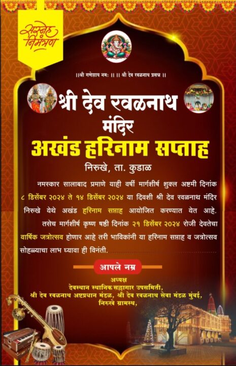 कुडाळ : श्री. देव रवळनाथ मंदिर निरूखे येथे प्रतिवर्षाप्रमाणे मार्गशीर्ष शुक्ल अष्टमी दिनांक ८ डिसेंबर २०२४ ते १४ डिसेंबर २०२४ या कालावधीत अखंड हरिनाम सप्ताहाचे आयोजन करण्यात आले आहे.