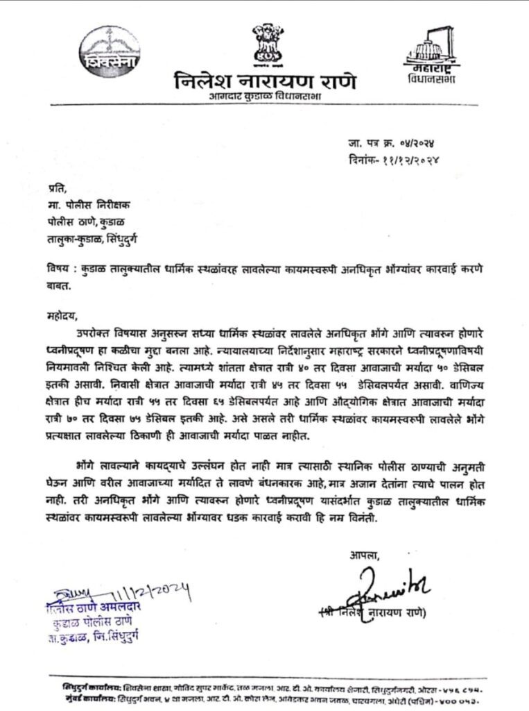 भोंगे लावल्याने कायद्याचे उल्लंघन होत नाही मात्र त्यासाठी स्थानिक पोलीस ठाण्याची अनुमती घेऊन आणि वरील आवाजाच्या मर्यादित ते लावणे बंधनकारक आहे, मात्र अजान देतांना त्याचे पालन होत नाही. तरी अनधिकृत भोंगे आणि त्यावरून होणारे ध्वनीप्रदूषण यासंदर्भात कुडाळ तालुक्यातील धार्मिक स्थळांवर कायमस्वरूपी लावलेल्या भोंग्यावर धडक कारवाई करावी अशी मागणी आ. निलेश राणे यांनी कुडाळच्या पोलीस निरिक्षकांकडे निवेदनाद्वारे केली आहे.