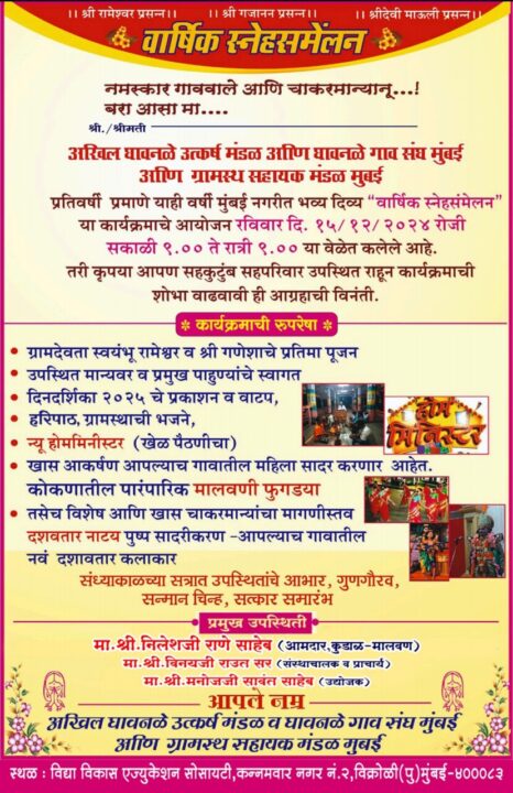 मुंबई : अखिल घावनळे उत्कर्ष मंडळ मुंबई आणि घावनळे गाव संघ मुंबई आणि ग्रामस्थ सहायक मंडळ मुंबई यांच्या संयुक्त विद्यमाने स्नेहसंमेलनाचे मुंबई येथे आले आहे. हा कार्यक्रम रविवार दि. १५ डिसेंबर २०२४ रोजी सकाळी ९.०० तेज्युकेशन सोसायटी, कन्नमवार नगर २ विक्रोळी (पू.) येथे होणार असून या दिवशी विविध धार्मिक कर्मणूक कार्यक्रम सादर करण्यात आला आहे.
