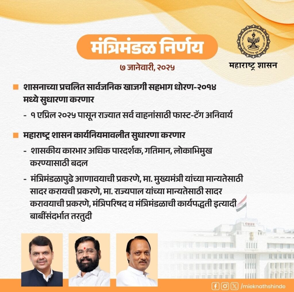मुंबई: आज राज्य सरकारच्या मंत्रिमंडळाची बैठक पार पडली असून या बैठकीमध्ये फास्ट टॅगबाबत महत्वाचा निर्णय घेण्यात आला आहे. शासनाच्या प्रचलित सार्वजनिक खासगी सहभाग धोरण- २०१४ मध्ये सुधारणा करणार असून १ एप्रिल २०२५ पासून राज्यात सर्व वाहनांसाठी फास्ट-टॅग अनिवार्य करण्यात आला आहे. याचबरोबर इथून पुढे होणाऱ्या मंत्रिमंडळाच्या बैठका पेपरलेस होणार आहेत असाही निर्णय घेण्यात आला.१ एप्रिल २०२५ पासून सर्व वाहनांसाठी फास्ट टॅग अनिवार्य करण्यात आले आहे. टोलनाका पार करण्यासाठी सर्व वाहनांवर फास्ट टॅग लावणे सरकारकडून बंधनकारक करण्यात आले आहे. प्रवास वेगवान करण्याच्या उद्देशाने सरकारकडून हा निर्णय घेतला आहे.
