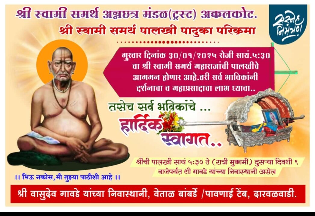 कुडाळ : गुरुवार दिनांक ३० जानेवारी २०२५ रोजी सायं. ५.३० वाजता श्री. वासुदेव गावडे यांच्या निवासस्थानी श्री स्वामी समर्थ महाराजांच्या पालखीचे आगमन होणार आहे. श्रींची पालखी सायं. ५.३० ते दुसऱ्या दिवशी सकाळी ९.०० वाजेपर्यंत गावडे यांच्या निवासस्थानी असेल. तेव्हा सर्व भाविकांनी दर्शनाचा व महाप्रसादाचा लाभ घ्यावा असे आवाहन गावडे कुटुंबियांच्या वतीने करण्यात आले आहे.