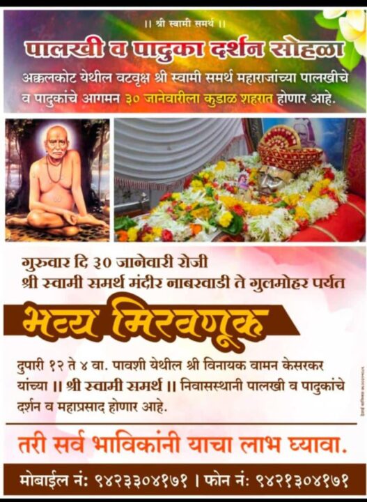 कुडाळ : गुरुवार दिनांक ३० जानेवारी २०२५ रोजी दुपारी १२ वाजता श्री. विनायक वामन केसरकर यांच्या श्री स्वामी समर्थ निवासस्थानी श्री स्वामी समर्थ महाराजांच्या पालखीचे आगमन होणार आहे. संध्याकाळी ४ वाजेपर्यंत पालखी विनायक वामन केसरकर यांच्या घरी असणार आहे , तेव्हा सर्व भाविकांनी दर्शनाचा व महाप्रसादाचा लाभ घ्यावा असे आवाहन केसरकर कुटुंबियांच्या वतीने करण्यात आले आहे.