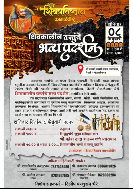 आपल्या सर्वांचे आराध्य दैवत छत्रपती शिवाजी महाराजांच्या स्मृतींना उजाळा देण्यासाठी शिवप्रतिष्ठान कमळेवीर यांनी शनिवार दिनांक ८ फेब्रुवारी २०२५ रोजी श्री स्वामी समर्थ मंगल कार्यालय, नेमळे पोकळेनगर येथे शिवकालीन वस्तूंचे भव्य प्रदर्शन आयोजित केले आहे.