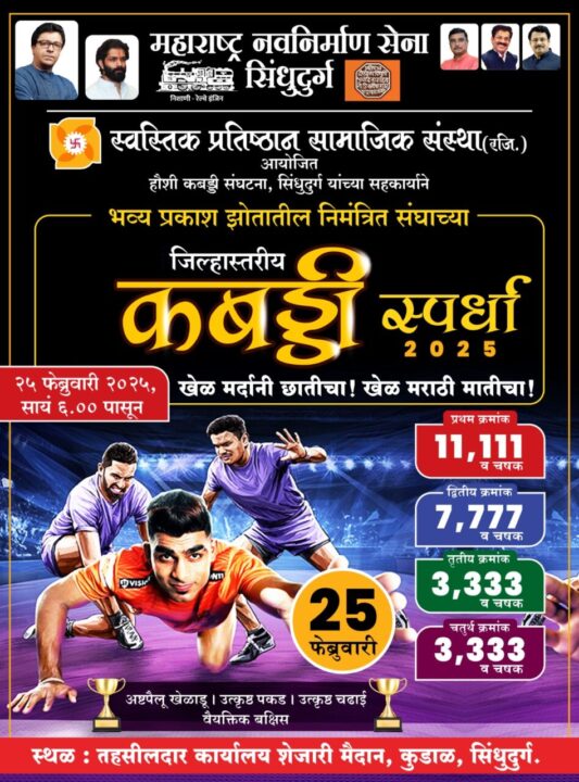 कुडाळ : महाराष्ट्र नवनिर्माण सेना सिंधुदुर्ग आणि स्वस्तिक प्रतिष्ठान सामाजिक संस्था (रजि.) त्यांच्या संयुक्त विद्यामाने. हौशी कबड्डी संघटना,सिंधुदुर्ग यांच्या सहकार्याने प्रकाश झोतातील निमंत्रित संघाच्या कबड्डी स्पर्धा २०२५ चे आयोजीत केल्या असुन. मंगळवार दि.२५ फेब्रुवारी सायं ६ वा.. या स्पर्धेचे उद्घाटन होणार आहे. स्पर्धा तहसीलदार ऑफिस शेजारील मैदानात होणार आहेत.