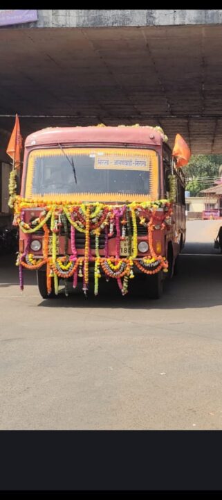 या बसला आकर्षक पद्धतीने फुलांची सजावट केली होती. ही बस दिवसरात्र दिमाखात भगवा झेंडा फडकावत निरुखे ते आंगणेवाडी अशी ये-जा करीत होती. या बस सेवेने भाविकांचे लक्ष वेधून घेतले. बसचे चालक प्रदीप तेरसे आणि वाहक संतोष पालव यांनी भाविकांची सेवा बजावली. भाविकांनी त्यांचे कौतुक केले. एसटी बसची सजावट निरुखे गावातील ग्रामस्थांनी केली होती.