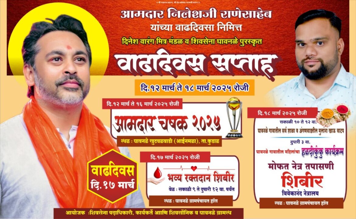 कुडाळ : कुडाळ – मालवणचे आमदार निलेश राणे यांच्या वाढदिवसानिमित्त दिनांक १२ मार्च ते १८ मार्च २०२५ या कालावधीत दिनेश वारंग मित्रमंडळ, शिवसेना पदाधिकारी, कार्यकर्ते व घावनळे ग्रामस्थ यांच्या माध्यमातून वाढदिवस सप्ताहाचे आयोजन करण्यात आले आहे. या कालावधीत विविध कार्यक्रमांचे आयोजन करण्यात आले आहे.