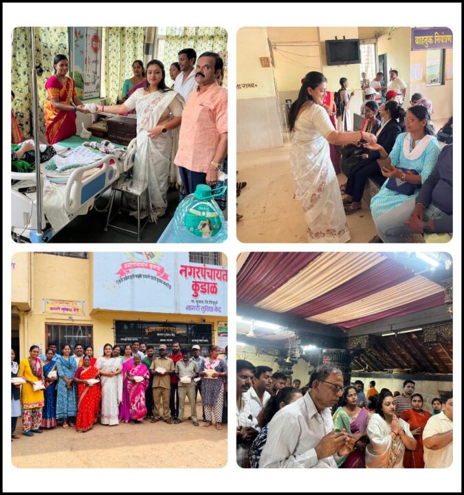 कुडाळ : कुडाळ – मालवणचे आमदार निलेश राणे यांचा वाढदिवस विविध उपक्रमांनी साजरा करण्यात आला. कुडाळ बस स्थानक येथे प्रवाशांना मिठाईवाटप करण्यात आली. तर महिला व बाल रुग्णालय येथे रुग्णांना फळ वाटप कार्यक्रम पार पडला. तर कुडाळ नगरपंचायत मधील सफाई कर्मचाऱ्यांना एक किलो साखर व एक किलो रवा असे जीवनावश्यक वस्तूंचे वाटप करण्यात आले. यावेळी नगरपंचायत च्या पन्नास कर्मचाऱ्यांना वाटप करण्यात आले. यावेळी माजी जिल्हा परिषद अध्यक्ष संजय पडते कुडाळ नगरपंचायत नगराध्यक्ष प्राजक्ता शिरवलकर, नगरसेविका नयना मांजरेकर, चांदणी कांबळी, गणेश भोगटे, शिवसेना शहर प्रमुख रोहित भोगटे, रेवती राणे, चंदन कांबळी, राकेश वर्दम, श्रुती वर्दम, प्रसन्न गंगावणे, निलेश शिरसाट, अविनाश पाटील तसेच मोठ्या संख्येने शिवसेना कार्यकर्ते व पदाधिकारी उपस्थित होते. यावेळी नगराध्यक्ष प्राजक्ता शिरवलकर तसेच नगरसेवक यांच्या उपस्थितीत कुडाळ एसटी स्टँड वरील प्रवाशांना मिठाई वाटप केले. त्याबाबत उपस्थित प्रवाशांमधून समाधान व्यक्त करण्यात आले. महिला व बाल रुग्णालय येथे संजय पडते यांच्या उपस्थितीत रुग्णांना फळ वाटप करण्यात आले. नगराध्यक्ष प्राजक्ता शिरवलकर यांच्या नेतृत्वाखाली कुडाळ नगरपंचायत येथे 50 सफाई कर्मचाऱ्यांना साखर व रवा वाटप करण्यात आले. यावेळी नगरपंचायत मधील अधिकारी व कर्मचारी वृंद उपस्थित होते. शिवसेना कुडाळ शहर यांच्या वतीने घेण्यात आलेल्या समाज उपयोगी कार्यक्रमाबाबत कुडाळ शहरात जनतेमधून समाधान व्यक्त केले जात आहे.