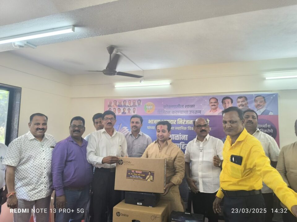 सिंधुदुर्ग : संपूर्ण कोकणातील शाळा डिजिटल करण्याची महत्त्वाकांक्षी संकल्पना मनाशी बाळगून शैक्षणिक प्रगती होण्याच्या दृष्टीने विशेष प्रयत्न करणाऱ्या खासदार श्री.नारायणराव राणे  आणि रविंद्र चव्हाण  यांच्या सुचनेनुसार भाजप आमदार श्री निरंजन डावखरे  यांच्या स्थानिक विकास निधीतून जिल्ह्यातील ३५शाळांना नितेश राणे  यांच्या हस्ते संगणक व प्रोजेक्टर वाटप करण्यात आले.