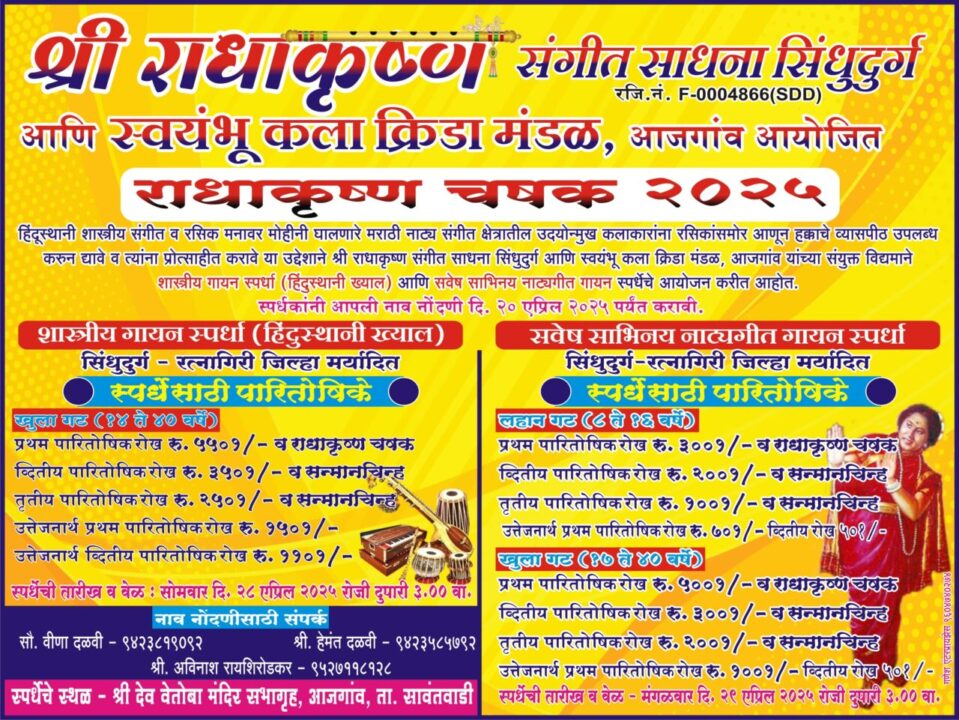 ‘श्री राधाकृष्ण संगीत साधना सिंधुदुर्ग’ या संस्थेच्या वतीने व ‘स्वयंभू कला क्रीडा मंडळ, आजगांव’ यांच्या सहकार्याने आयोजन