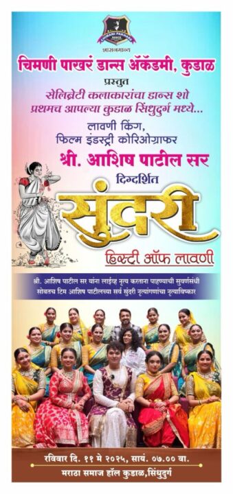 कुडाळ : चिमणी पाखरं डान्स अकॅडमी, कुडाळ प्रस्तुत सेलिब्रिटी कलाकारांचा डान्स शो प्रथमच आपल्या कुडाळ, सिंधुदुर्गमध्ये सादर होत आहे. या शोमध्ये आपल्याला लावणी किंग, फिल्म इंडस्ट्री कोरियोग्राफर श्री. आशिष पाटील सर दिग्दर्शित सुंदरी हिस्ट्री ऑफ लावणी पाहता येणार आहे.