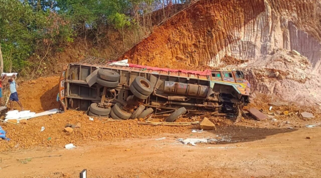 कणकवली : मुंबई गोवा महामार्गावरील हळवल फाटा येथे माल वाहतूक करणारा ट्रक पलटी झाला. काल मंगळवारी सायंकाळी सहाच्या सुमारास ही घटना घडली. गुजरात ते गोवा जाणाऱ्या या ट्रक चालकाला वळणाचा अंदाज आला नाही. हा ट्रक हळवल फाट्यावर पलटी झाला. ट्रकचा भरधाव असल्याने अपघातानंतर हा ट्रक रस्त्या लगतच्या मातीच्या ढिगाऱ्याला आदळला आणि आडवा झाला. यात ट्रकची पुढील चाके तुटून पडली होती. तसेच पुढील भागाचे मोठे नुकसान झाले आहे. या अपघाताची पोलीस ठाण्यात नोंद झाली नव्हती. दरम्यान आज या ट्रकमधील साहित्य दुसऱ्या वाहनातून गोवा येथे पाठविण्यात आले.