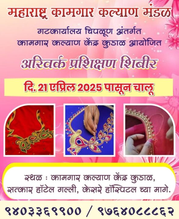 कुडाळ : महाराष्ट्र कामगार कल्याण मंडळ, विभाग ठाणे, गट चिपळूण अंतर्गत कामगार कल्याण केंद्र कुडाळ आयोजित अरिवर्क प्रशिक्षण शिबिराला सोमवार दिनांक २१ एप्रिल २०२५ पासून सुरुवात होणार आहे. तेव्हा जास्तीत जास्त महिलांनी मोठ्या संख्येने उपस्थित राहून या शिबिराचा लाभ घ्यावा असे आवाहन आयोजकांनी केले आहे.