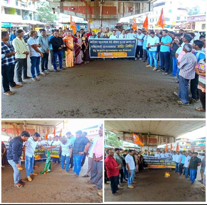 जम्मू -काश्मीरमधील पहलगाम येथे पाकिस्तानी दहशतवाद्यांनी केलेल्या हल्ल्याचा सिंधुदुर्ग जिल्हा शिवसेना उद्धव बाळासाहेब ठाकरे पक्षाने आज कणकवली पटवर्धन चौकात तीव्र स्वरूपात निषेध केला. यावेळी पाकिस्तानचा झेंडा पायदळी तुडवून तो जाळण्यात आला. यावेळी मुडदाबाद, मुडदाबाद  पाकिस्तान मुडदाबाद! एक-दो, एक-दो पाकिस्तान को फेकदो, केंद्र सरकार हाय हाय! अशा घोषणा देऊन शिवसैनिकांनी परिसर दणाणून सोडला.माजी आमदार वैभव नाईक, माजी आमदार परशुराम उपरकर,जिल्हाप्रमुख संदेश पारकर, कणकवली विधानसभा प्रमुख सतीश सावंत, महिला जिल्हाप्रमुख नीलम पालव, युवासेना जिल्हाप्रमुख सुशांत नाईक यांच्या नेतृत्वाखाली हे आंदोलन छेडण्यात आले. शिवसेना नेते आणि शिवसैनिकांनी हाताला काळ्या फिती बांधून हल्ल्याचा निषेध नोंदविला तसेच या अतिरेकी हल्यात मृत पावलेल्या नागरिकांसाठी दोन मिनिट स्तब्ध उभे राहत श्रद्धांजली वाहण्यात आली.