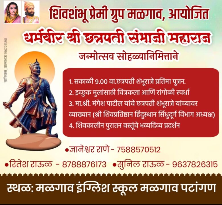 यनिमित्त सकाळी ९.०० वाजता छत्रपती संभाजी महाराज प्रतिमा पूजन, त्यानंतर इच्छुक मुलांसाठी चित्रकला आणि रांगोळी, सायंकाळी ६.०० वाजता श्री शिवप्रतिष्ठान हिंदुस्थान सिंधुदुर्ग विभाग अध्यक्ष मंगेश पाटील यांचे श्री छत्रपती संभाजी महाराज यांच्यावर व्याख्यान आदी कार्यक्रम होणार आहेत. श्री छत्रपती संभाजी महाराज जन्मोत्सवानिमित्त सकाळपासून ते सायंकाळपर्यंत शिवकालीन पुरातन वस्तुंचे प्रदर्शन यावेळी मांडण्यात येणार आहे. या कार्यक्रमासाठी कोणाला देणगी स्वरूपात मदत करायची असेल त्यांनी सुनील राऊळ-९६३७८२६३१५, गजानन राऊळ-९४०३५६१४२९, ज्ञानेश्वर राणे-७५८८५७०५१२ व रितेश राऊळ-८७८८८७६१७३ यांच्याशी संपर्क साधावा. मळगाव तसेच परिसरातील शिवशंभू प्रेमींनी श्री छत्रपती संभाजी महाराज जमोत्सवानिमित्त होणाऱ्या सर्व कार्यक्रमांचा व शिवकालीन वस्तू प्रदर्शनाचा लाभ घ्यावा, असे आवाहन शिवशंभू प्रेमी ग्रुपच्यावतीने करण्यात आले आहे.