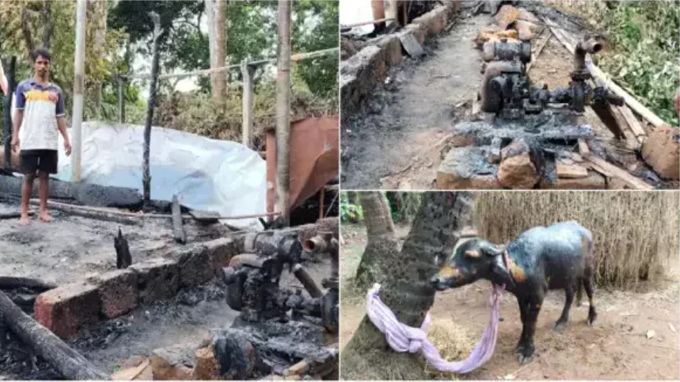 मालवण : तालुक्यातिल मसुरे कावावाडी येथील मंदार सदानंद मुणगेकर या गरीब शेतकऱ्याच्या शेतामध्ये असणाऱ्या शेतमांगराला शुक्रवारी रात्री साडेआठच्या सुमारास अचानक आग लागून संपूर्ण शेतमांगार आगीच्या भक्षस्थानी पडला तर यामध्ये या गरीब शेतकऱ्याची चार जनावरे होरपळून जबर जखमी झालेली आहेत. अचानक लागलेल्या आगीमुळे या शेतकऱ्याचे सुमारे चार लाखाचे नुकसान झाले आहे. अतिशय गरीब परिस्थिती असलेल्या मंदार मुनगेकर याच्यापुढे शेती हंगामातच दुःखाचे सावट पसरले असून शासकीय पातळीवरती तसेच राजकीय पातळीवर मोठ्या मदतीची अपेक्षा येतील ग्रामस्थांनी व्यक्त केली आहे. या आगीचे नेमके कारण समजू शकले नाही.